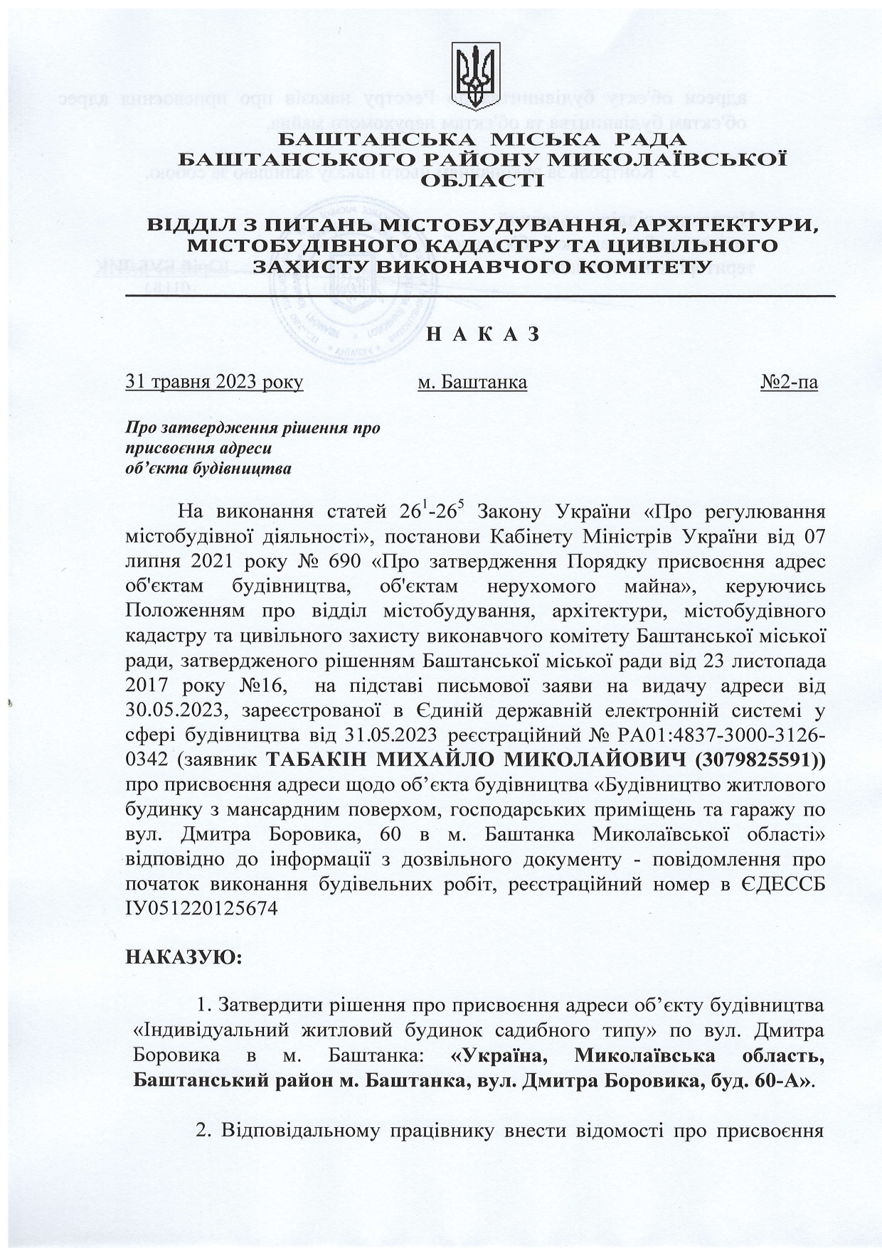 На підставі заяви гр. Трибрат О.М. присвоєну адресу нерухомому майну, житловий будинок.